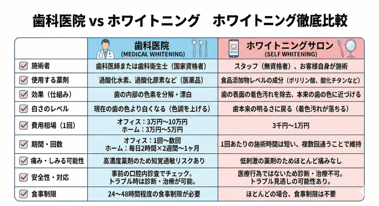 同じ「ポリリン酸」という成分が使われるホワイトニングであっても、歯科医院とホワイトニングサロンでは、その使い方や目的、そして期待できる効果に明確な違いがあります。この違いを理解することは、ご自身の目的や希望に合ったホワイトニングを選ぶ上で非常に重要です。